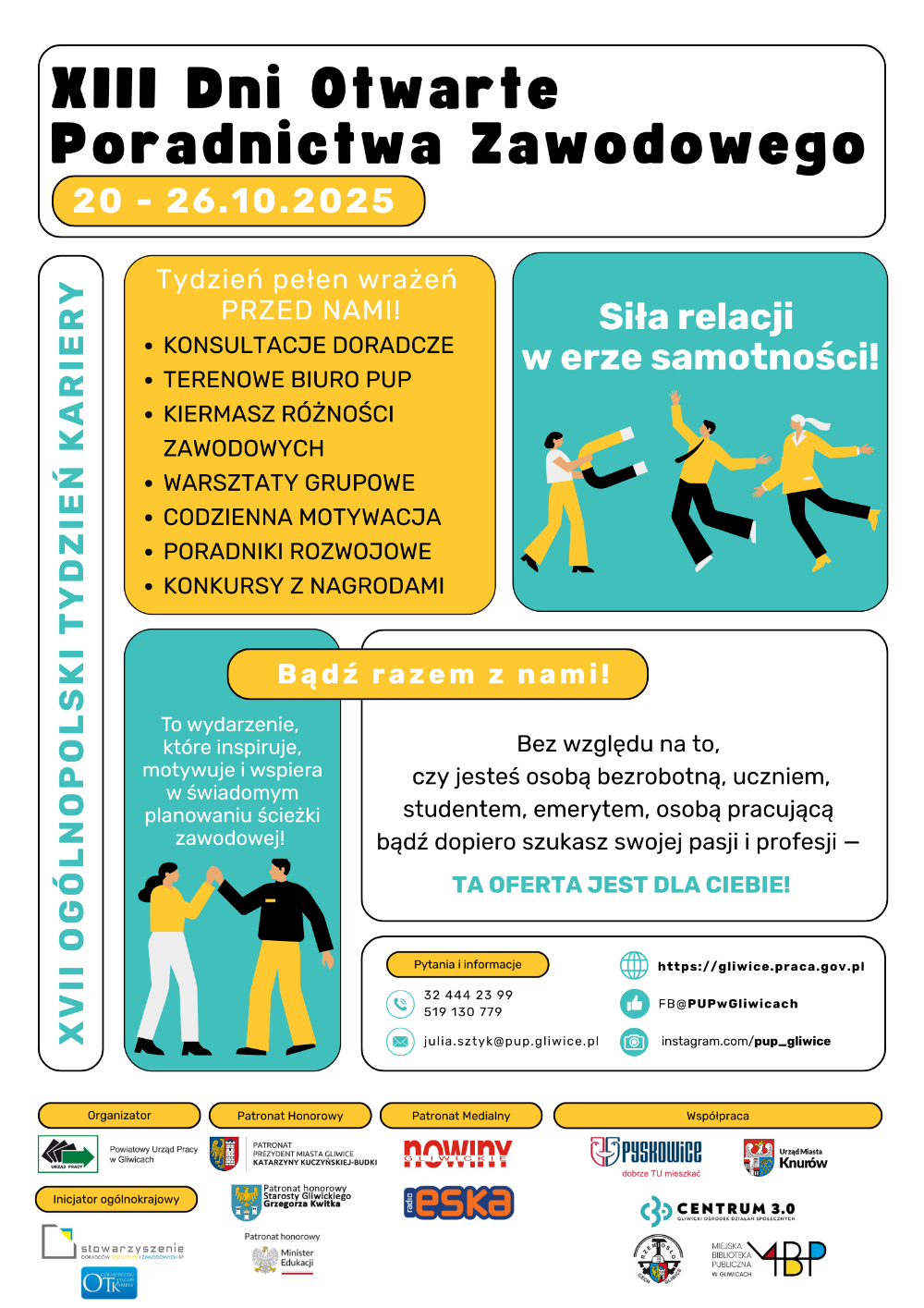 XIII Dni Otwarte Poradnictwa Zawodowego objęte zostały Patronatem Honorowym Prezydent Miasta Gliwice Pani Katarzyny Kuczyńskiej-Budki oraz Patronatem Honorowym Storosty Powiatu Gliwickiego Pana Grzegorza Kwitka. Naszymi Partnerami Medialnymi są: Nowiny Gliwickie i Radio Eska.